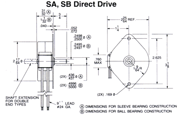 These popular, compact motors are available in two synchronous speeds: SA Series (300 RPM) and SB Series (600 RPM). Direct drive motors can be furnished with either sleeve or ball bearings. Double ended shafts may be specified.