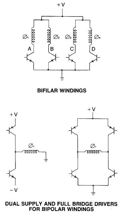 | Bifilar and Bipolar Operation The terms bifilar and bipolar refer to two different types of windings that may be used in the stator coils. Bipolar windings contain a single coil in each stator half. The switching circuitry used to reverse the direction of current flow with this coil is typically of the full bridge or dual supply type. Bifflar windings contain two coils in each stator haIf. When they ar econnected as show in the figure, the magnetic polarity of the stator teeth can be reversed by switching from one coil to the other of each pair with a unipolar supply. Note that although a bifilar-wound motor does contain four coils or "phases," it is operated as a two phase motor. Bifilar-wound PM steppers are widely used because of the drive circuit simplicity. All stock Hurst stepping motors use this winding configuration.Bifilar and bipolar-wound motors do exhibit some performance differences. Since the winding volume per phase of a bifilar-wound stepper is only half that of a bipolar-wound stepper, the attainable ampere-turns for a given input power will necessarily be lower for the bifilar-wound motor. Therefore, the torque is lower. However, with an L/R drive it is because the bipolar coil with its larger volume will also have a larger time constant. At higher stepping rates the bipolar-wound motor's torque will decrease to approximately the same level as that of the bifilar-wound motor. The choice of winding type will depend upon the application. The holding torque for a bipolar version of a given motor will be 20-30% higher than the bifilar version. Dynamic torque differences will depend upon the drive circuitry. With the simplest drive circuits the bipolar performance exceeds the bifilar performance only at low frequencies. As drive circuit complexity increases the bipolar performance becomes superior. |
