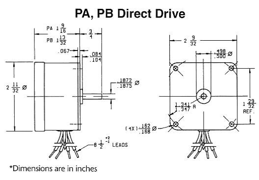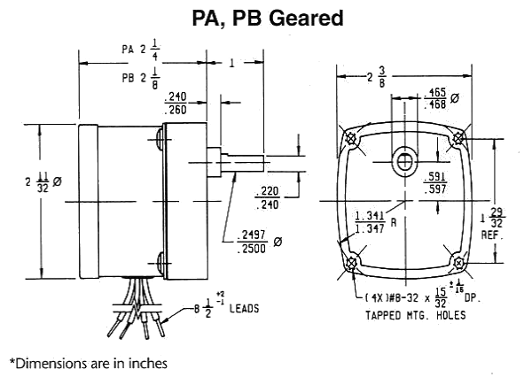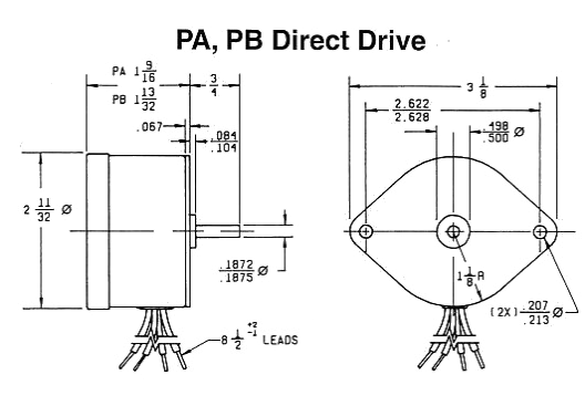 Mechanical dual speed versions of the PA and PB Series motors are available in the following standard RPM combinations: 3-30, 5-10, 6-12, 18-36, 30-60, and 36-72. Other speed combinations may be specified. Rotation is unidirectional. A choice of clockwise or counter clockwise must be specified. Dimensions are the same as gear reduction models. Maximum gear train loading is 35 ounce-inches for any RPM combination. Click here for gear train construction details.