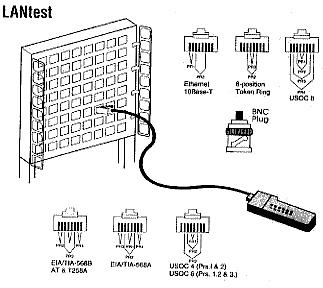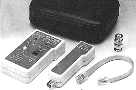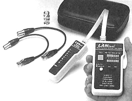 LANtest is a newly designed and very practical tester that can easily read the correct pin configuration of 10 Base-T cable, Category 5, 10 Base-2 cable (coax), RJ45/RJ11 modular cables, 356A,. EIA/TIA-568A/568B and Token Ring cable by comparing one transmitting end to the corresponding receiving end. With the remote kit it can test cables installed up to 1,000 feet either on wall plates or patch panels. It is easy to verify the cable continuity, open, short and crossed pairs.